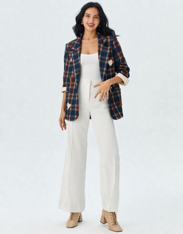Blazer à manches longues de couleur bleu marine. Composé d’un bouton de fermeture et de deux poches à l’avant. Doublure et épaulettes intégrées. Différentes rayures de différentes couleurs avec des patchs sur l’avant (cœurs, étoiles, strass,lettres)