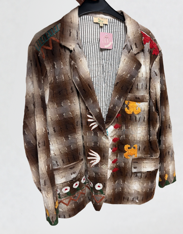 Blazer The Corner à manches longues. Imprimé abstrait et patchwork dans des tons terre (marron, beige, taupe), donnant un aspect presque vintage ou ethnique. Eléments brodés multicolores (jaune, rouge, blanc, vert) représentant des formes végétales, fleurs stylisées et motifs décoratifs, répartis sur le devant, les manches et le bas de la veste. Coupe droite et large, fente sur les côtés. Doublure intégrée à rayures