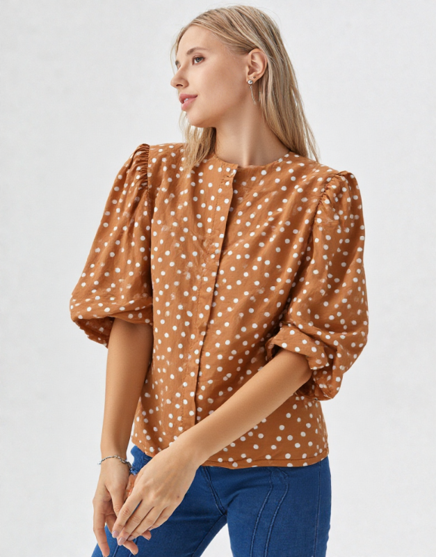 Blouse à manches courtes et col rond, de couleur camel ornée de pois bleu clair. Manches bouffantes. Patte de boutonnage sur toute la longueur au centre devant, dissimulée sous une surpiqûre