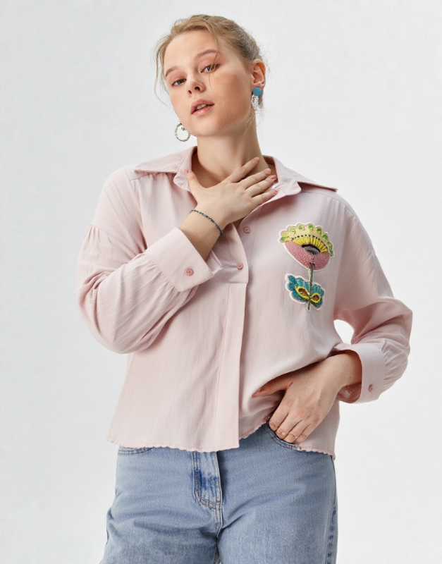 Blouse col chemise à manches longue de couleur rose poudré. Gros patch cousu au niveau de la poitrine côté gauche. Style de fleur avec des perles, des strass dans les tons clair (rose,jaune,vert). Coupe ample