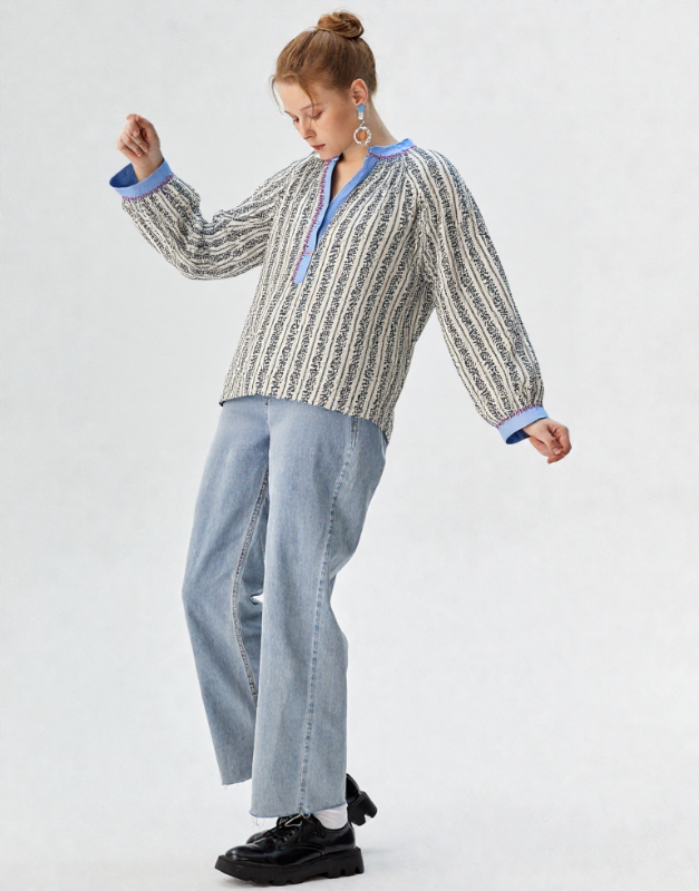 Blouse col v avec boutons de fermeture ainsi qu’aux poignets. Broderie rouge au col et aux poignets. Coupe ample. Effet de brillance. Légèrement plus longue à l’arrière