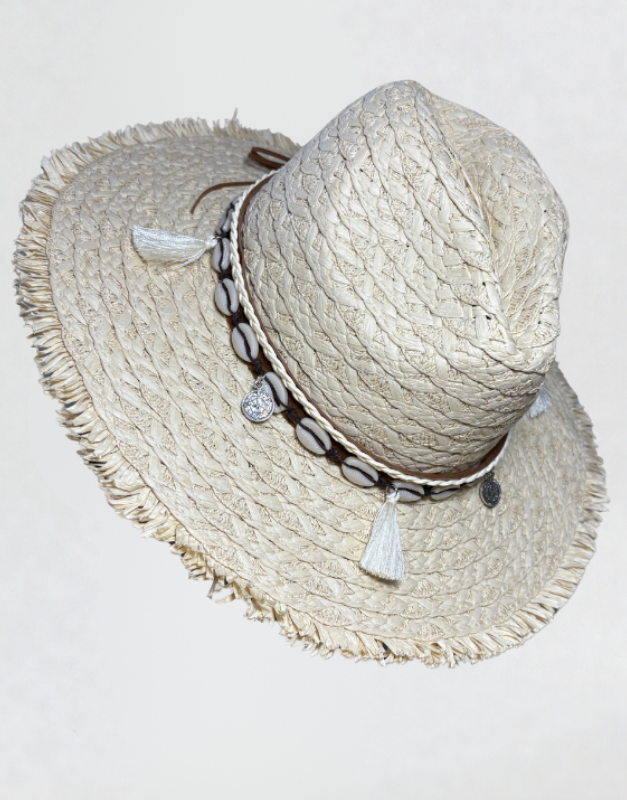 Chapeau de paille avec collier de coquillages, possibilité de l’enlever. Réglable à l’intérieur pour serrer le tour de tête