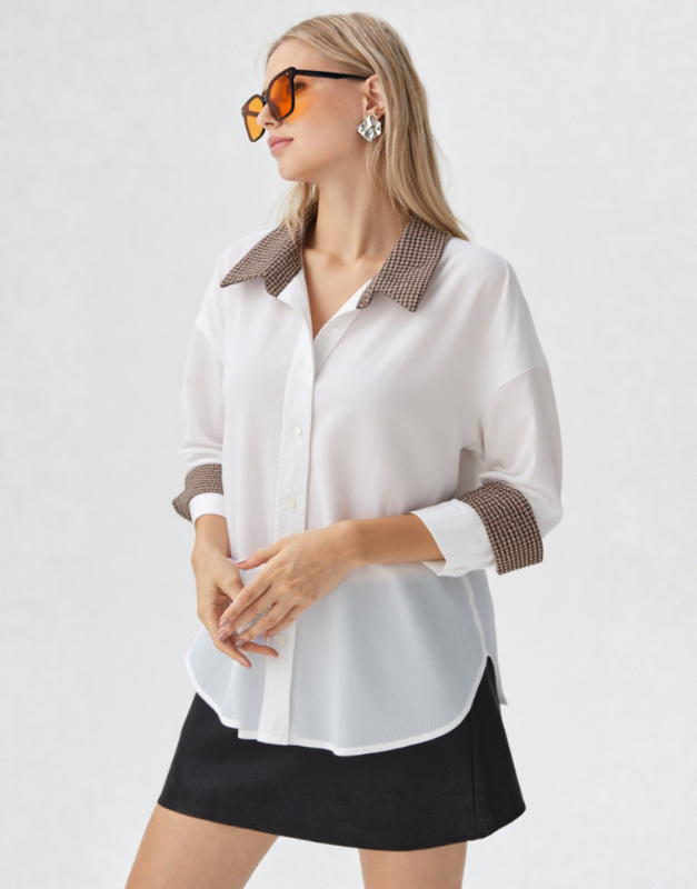 Chemise col pieds-de-poule et au niveau des manches longues. Coupe ample, plus longue à l’arrière. Pas transparente