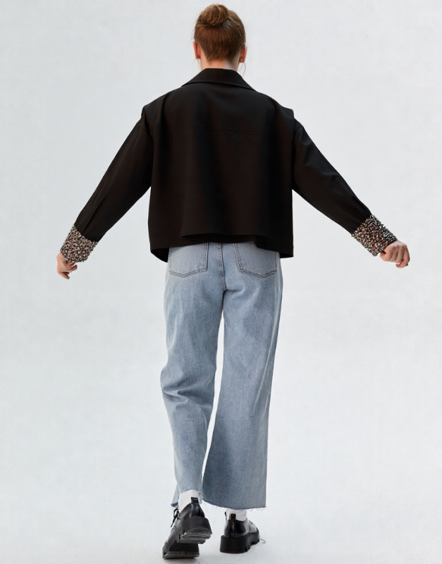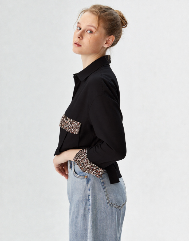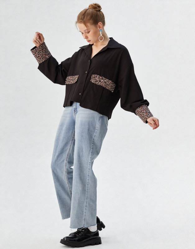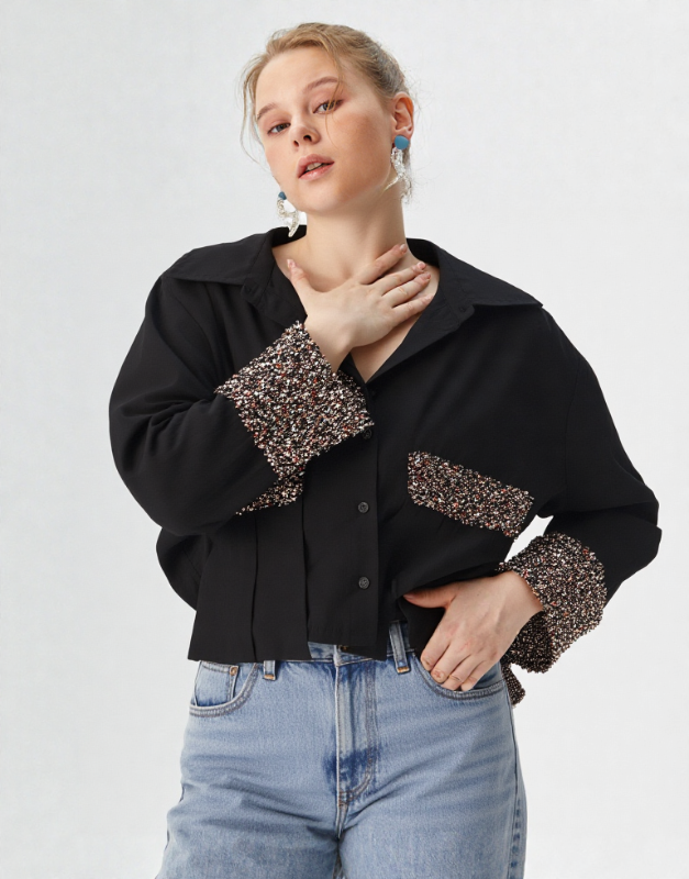 Chemise courte à manches longues, avec deux grandes poches minimaliste à l’avant. Bas de manches et dessus de poches en sequins
