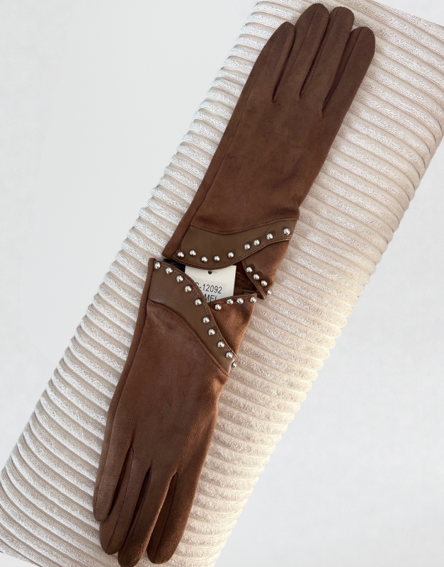 Gants croisés au niveau du poignet avec des petits clous. Doigts tactiles. Intérieur tout doux