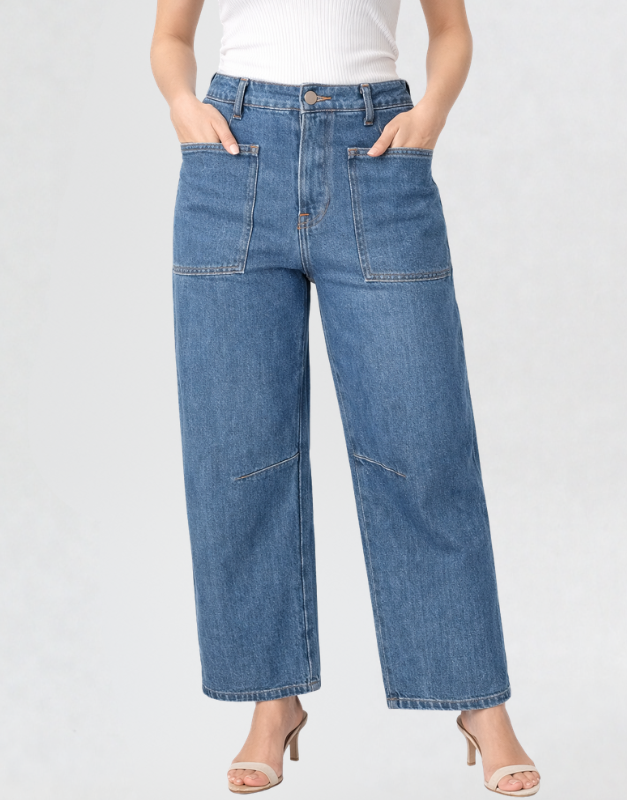 Jean « Johanna » coupe légèrement barrel. Composé de deux grandes poches à l’avant avec une fermeture éclair ainsi qu’un bouton. Élastique au niveau de l’arrière avec deux poches