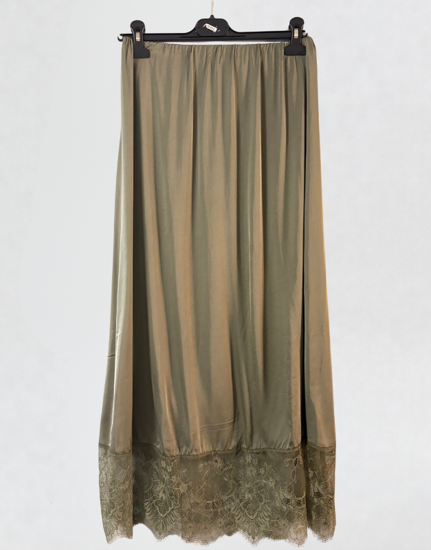 Jupe longue effet satin et dentelle sur le bas. Coupe droite légèrement évasé. Élastique au niveau de la taille