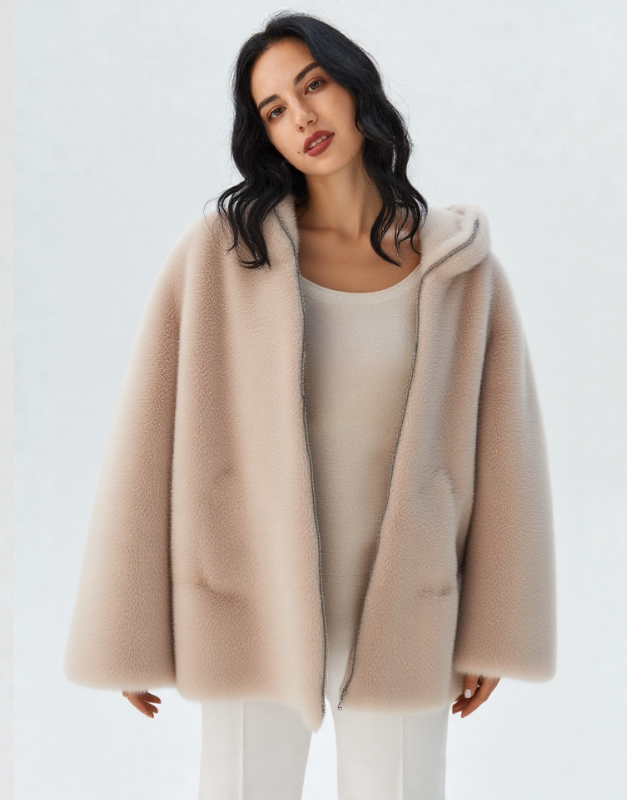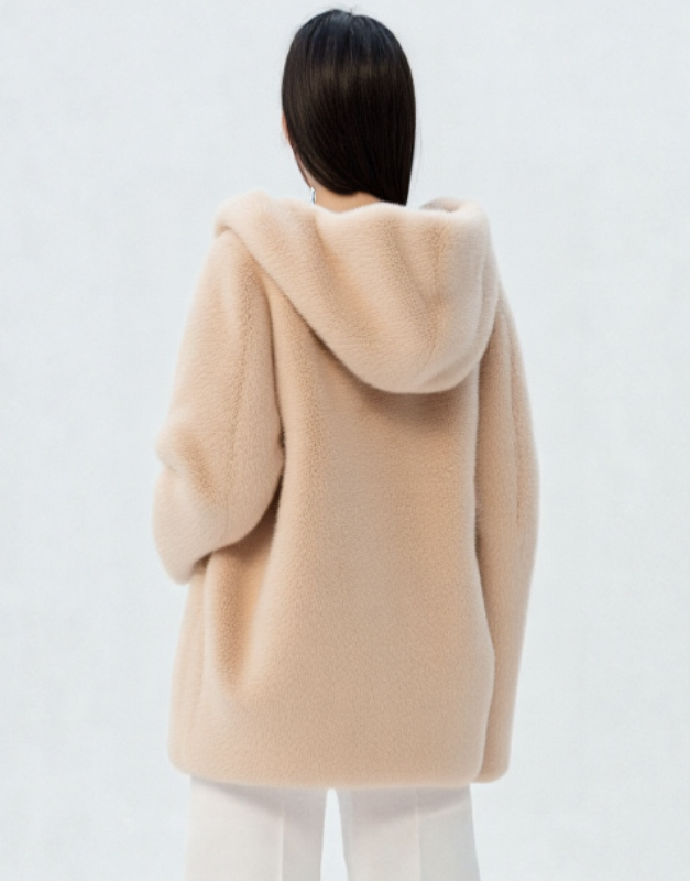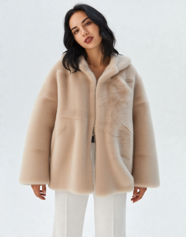 Manteau court Adoré fausse fourrure très douce, à poils courts. Col haut avec capuche, composé de deux poches latérales avant ainsi qu’une fermeture éclair. Grosse capuche. Intérieur effet suédine douce. Coupe ample