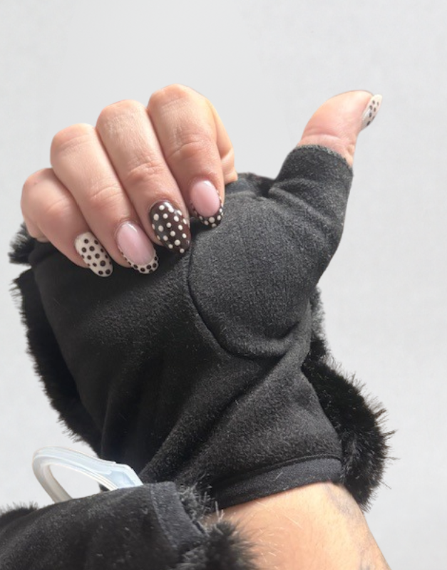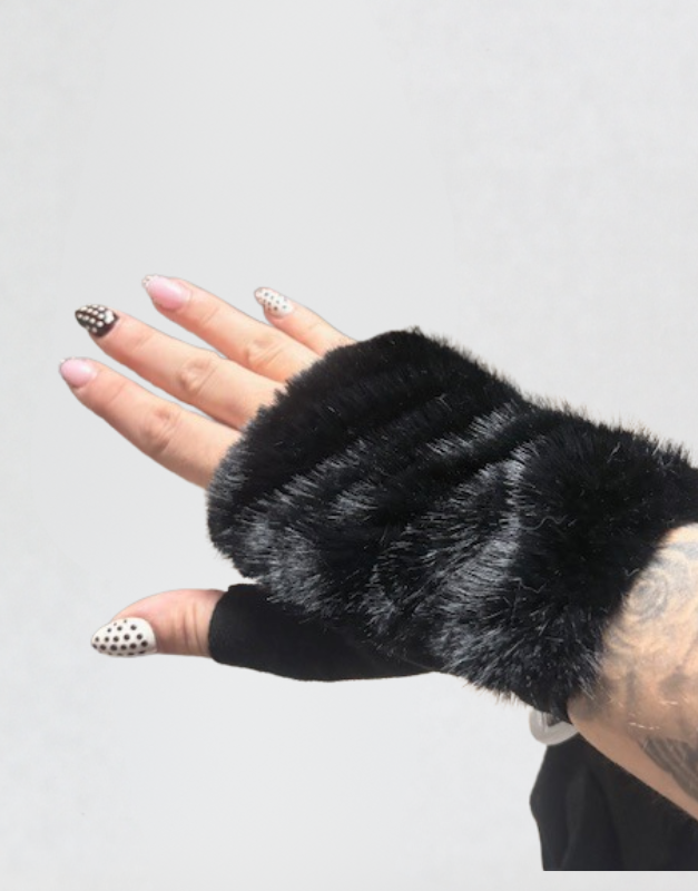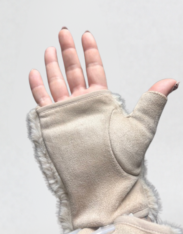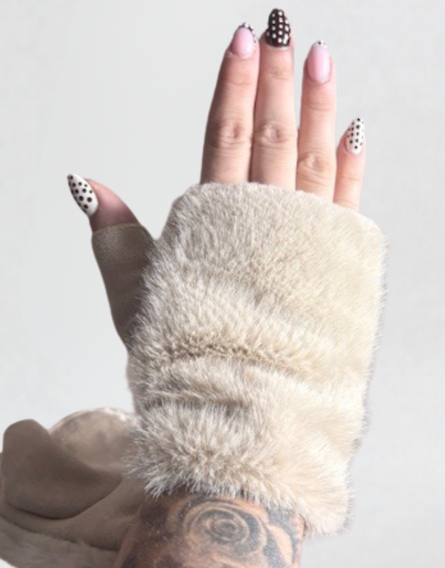 Mitaines courtes avec de la fourrure sur le dessus et uni à l’intérieur de la main. Tout doux à l’intérieur