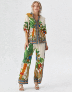 Pantalon fluide coupe large, effet soie au toucher. Style savane avec différents animaux, couleurs, motifs… Composé de deux poches latérales à l’avant, ainsi qu’un élastique à la taille avec un cordon