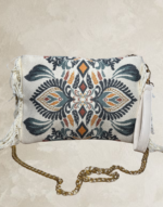 Petite pochette à motifs avec des petites franges sur les côtés. Composé d’une fermeture éclair et d’une chaine