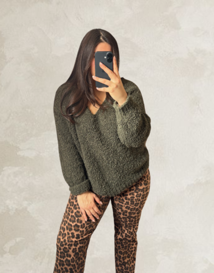 Pull à manches longues avec des petites fleurs brodées et une petite perle au centre de chaque fleur.