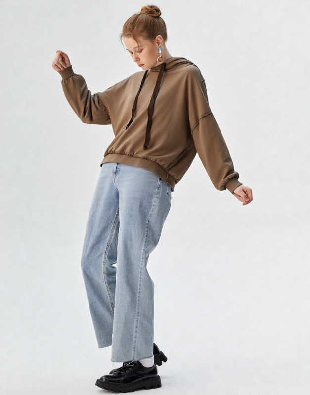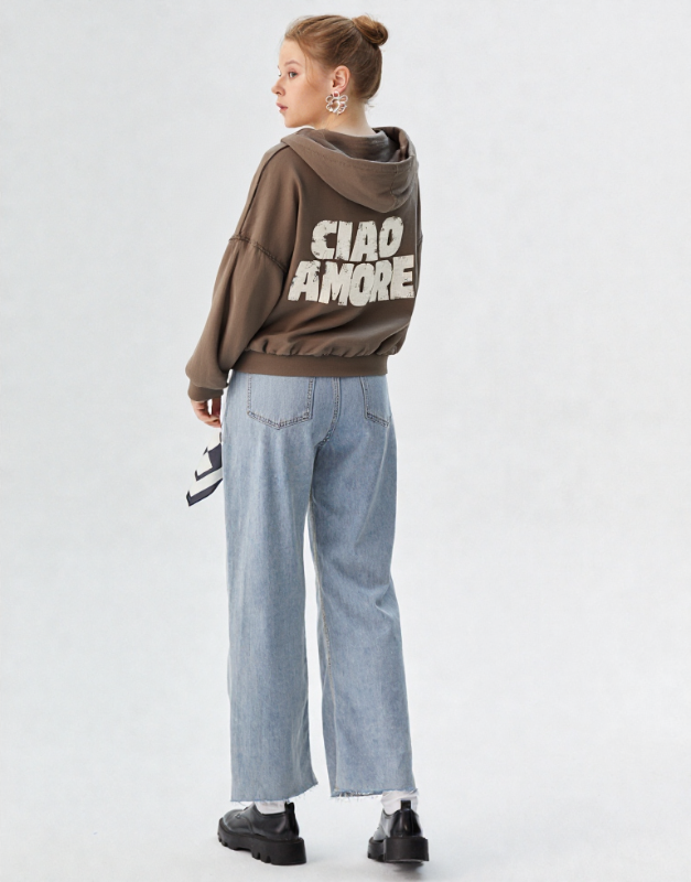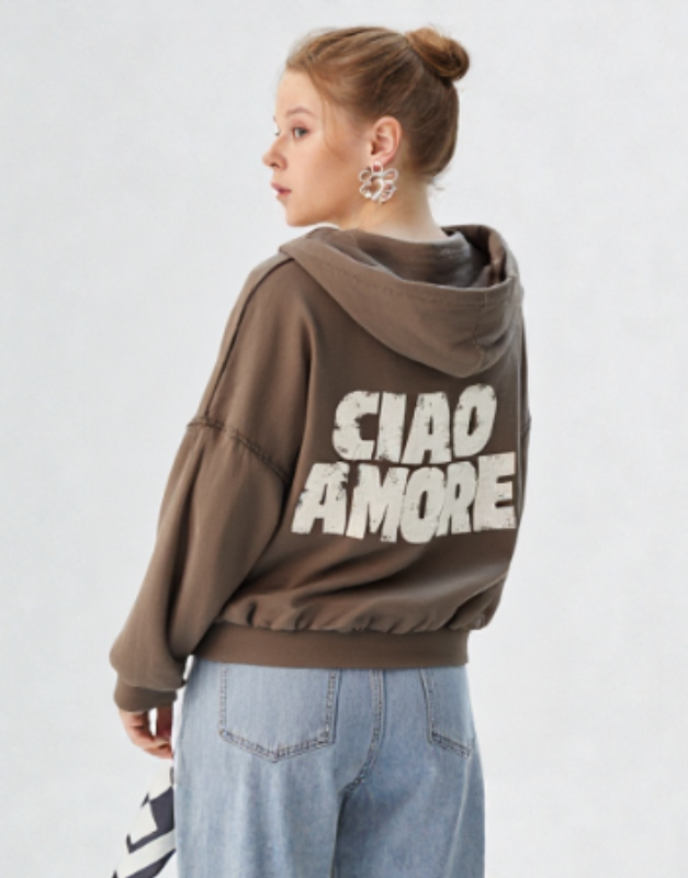 Sweat manches longues à capuche avec cordons, effet délavé. Uni à l’avant et inscription « CIAO AMORE » à l’arrière. Coutures apparentes sur les manches et les côtés. Coupe ample