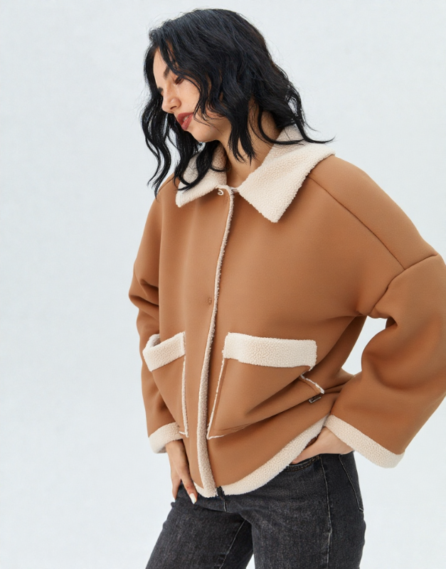 Grosse veste effet suédine à l’extérieur de couleur camel. Intérieur moumoute et col, couleur blanc écru. Deux grandes poches minimalistes sur le devant ainsi que deux boutons à pressions pour la fermeture. Col chemise